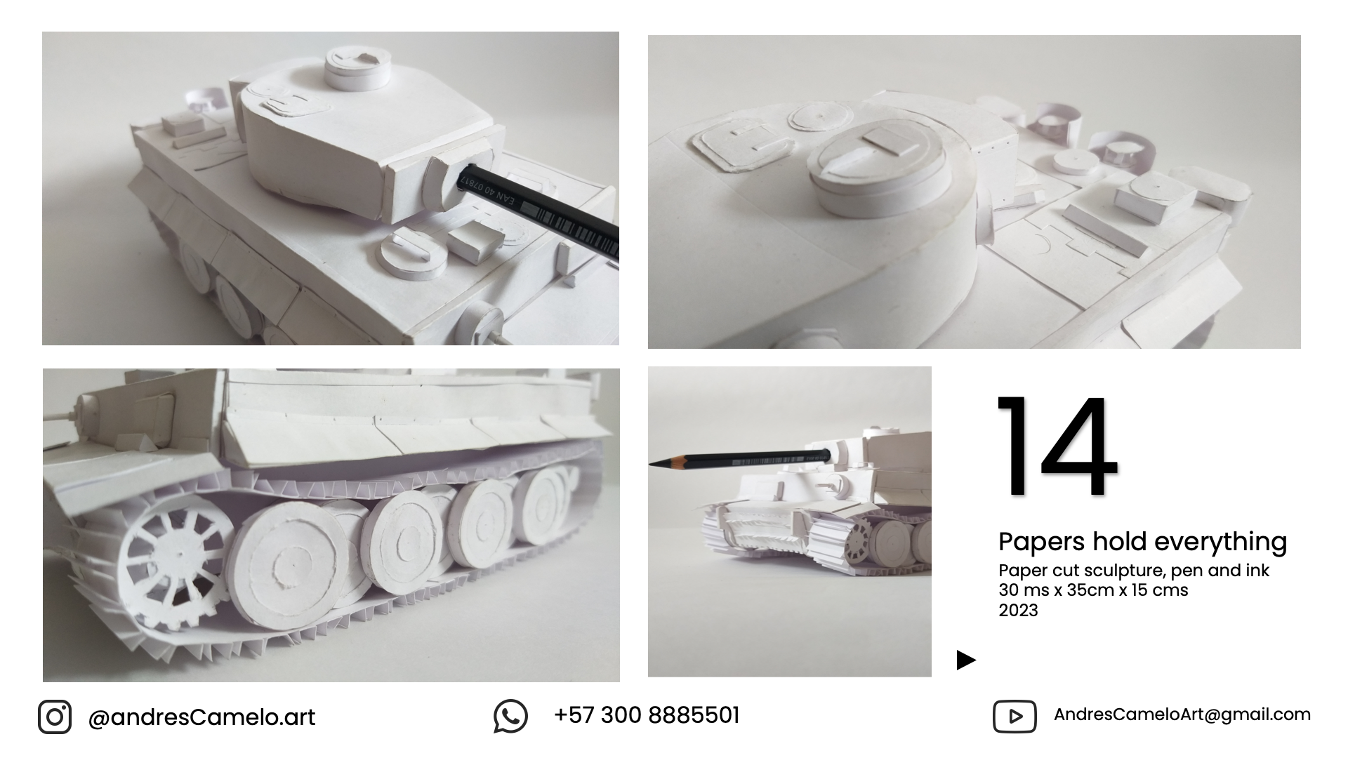 Paper cut sculpture, pen and ink